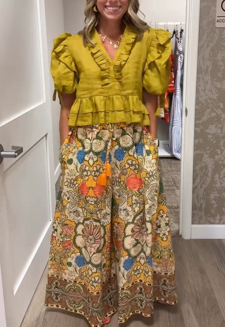 Ruffle Bubble Sleeve Blouse +Floral Printed Wide Leg Pants